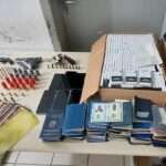 Após buscas no local, a polícia apreendeu um revólver calibre 32, uma garrucha calibre 22, uma pistola calibre 22, 14 munições calibre 32, 107 munições calibre 22, 20 munições calibre 12, três munições calibre 38, 18 caixas de remédio não controlado, 184 caixas de remédio controlado adquiridas no Paraguai, nove aparelhos celulares, R$ 1.398,00 em cédulas com indícios de falsificação, uma caixa contendo diversos documentos, sendo cédulas de identidade e carteiras de trabalho, vários carimbos de empresas, dois notebooks, um tablet e dois HD externo.